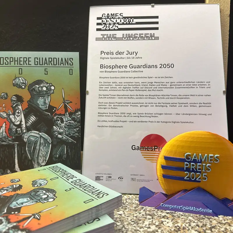 Über zweieinhalb Jahre hinweg haben sie gemeinsam das Konzept, die Geschichten und sogar das Buch erarbeitet – als internationales Kreativteam, das Nachhaltigkeit und Fantasie miteinander verbindet. Das Beste daran: Gebraucht werden nur zwei Würfel, ein Blatt Papier und ein wenig Fantasie. So ganz nebenbei: Biosphere Guardians 2050 hat dieses Jahr auch den Gamespreis der Computerspielakademie in der Kategorie „Digitale Spielkultur“ gewonnen. Das lag auch daran, dass dich die Jugendlichen über die digitale Online Plattform „Discord“ zum Entwickeln und Spielen des Games über gut 2 Jahre regelmäßig getroffen haben.